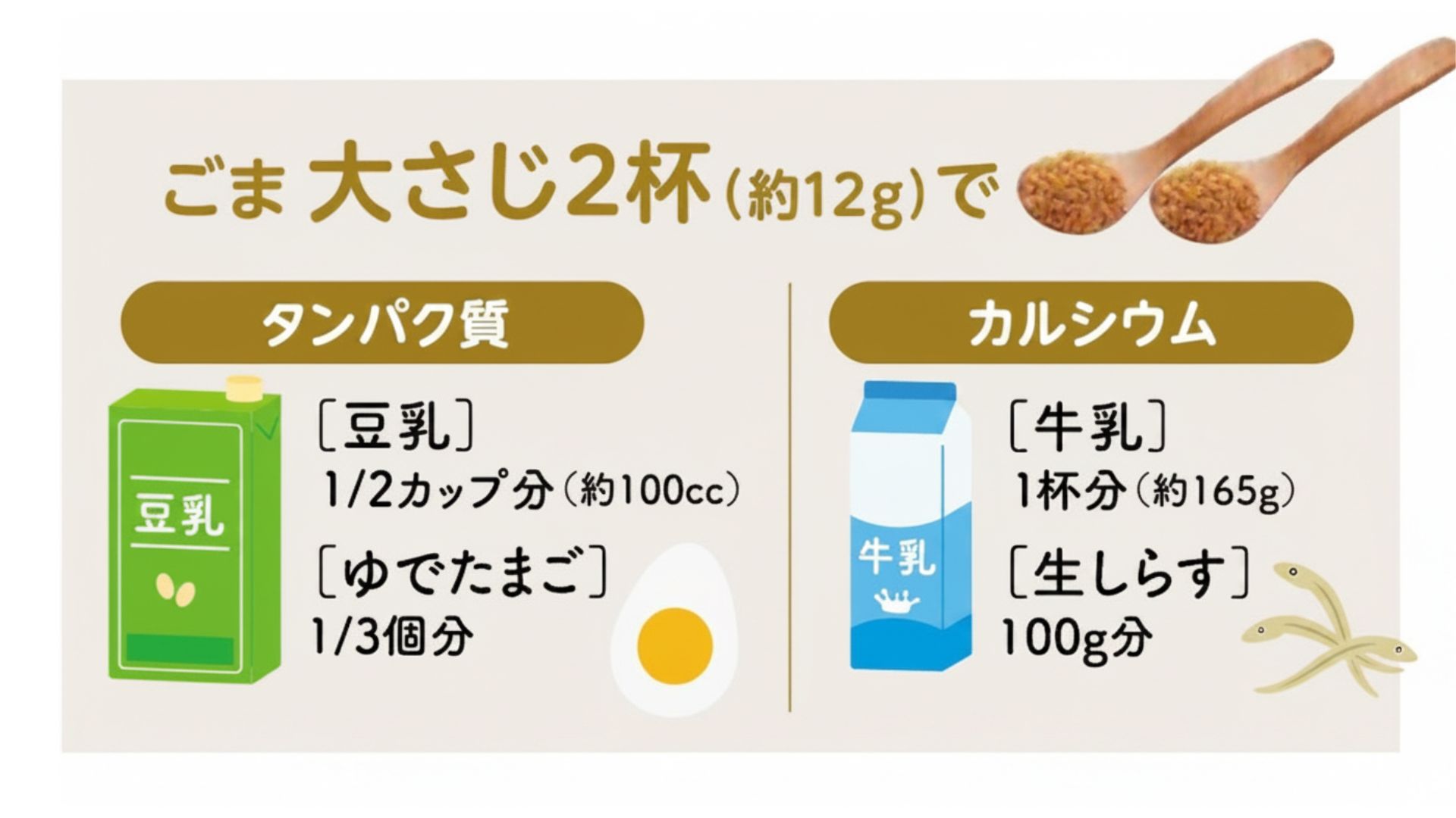 ごまは筋肉の構築や修復に必要な必須アミノ酸を含む良質なタンパク質を含んでいます。また、ごまに含まれるセサミンとセサモリンは抗酸化作用や抗炎症作用があり、筋肉量の減少を防ぎます。さらに、ごまにはカルシウム、マグネシウム、亜鉛、ビタミンB群などのミネラルやビタミンが豊富に含まれており、これらは骨密度の維持や免疫機能の向上に役立ちます。